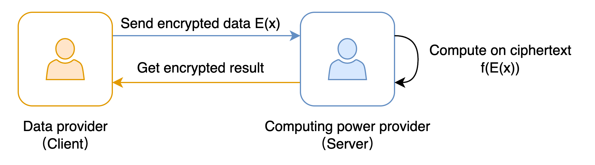 在一个典型的使用场景中,Client 是数据提供方,Server 是算力提供方,Client 并不信任 Server,因此 Client 可以把数据加密发送给 Server,Server 在密文数据上做计算,并把结果返回给 Client。