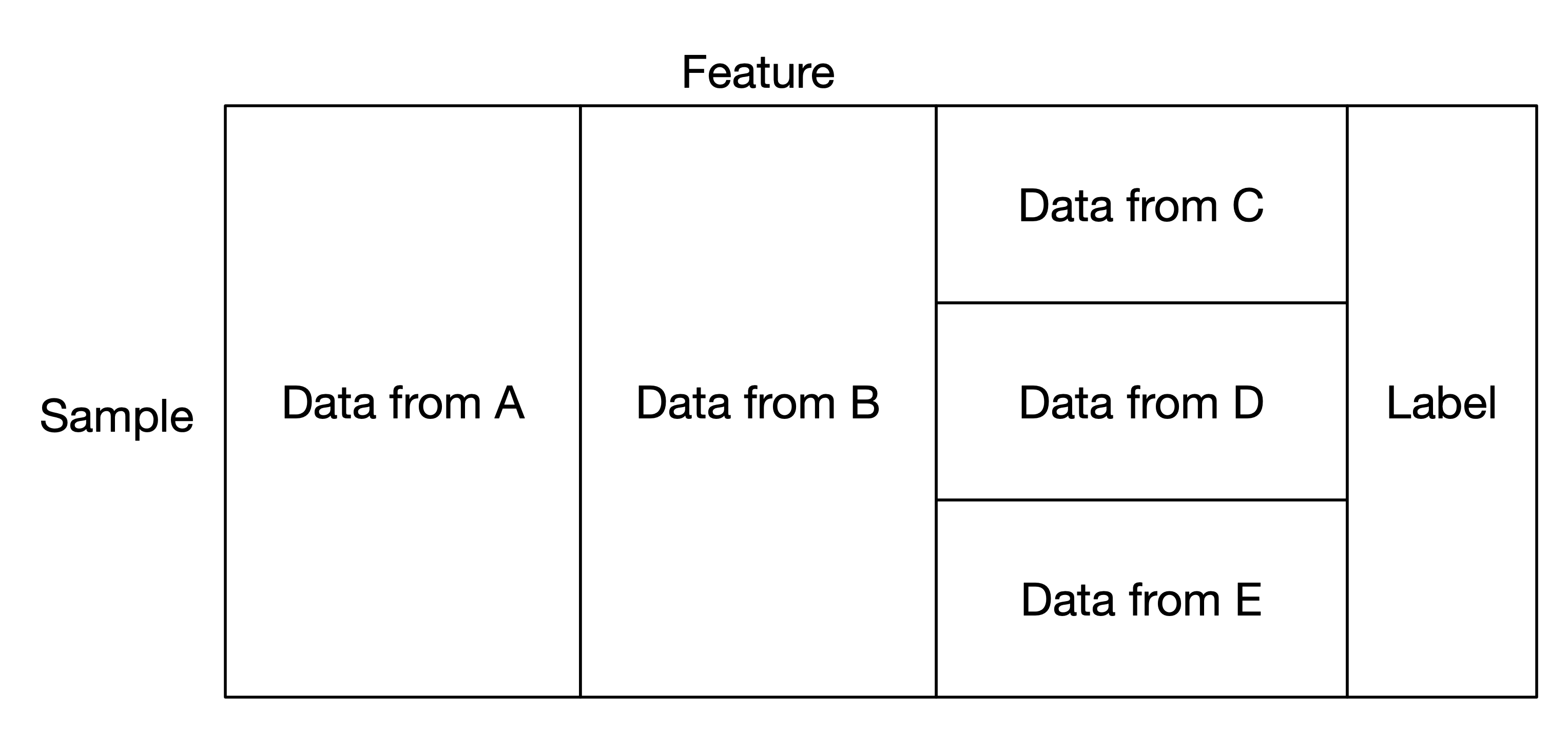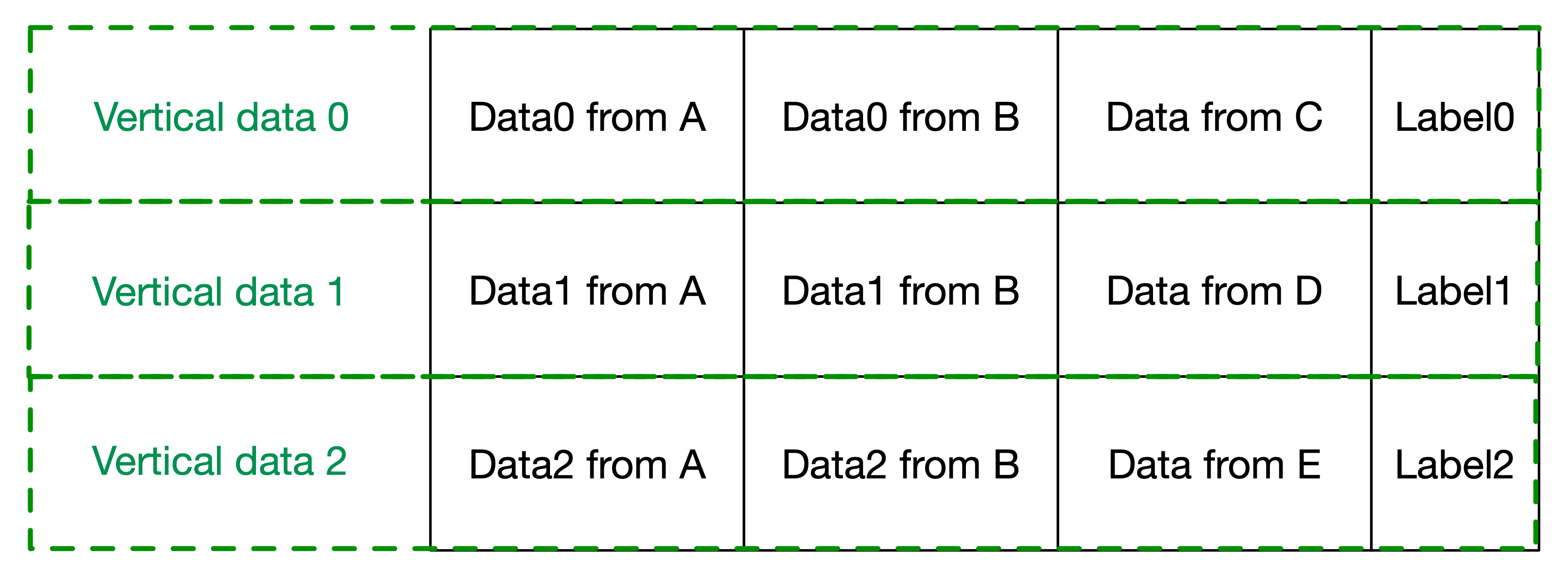 The vertical data 0 is consist of (data0 of A, data0 of B, data of C, label0) corresponding to same sample, and so on for vertical data 1 and 2.